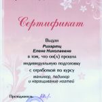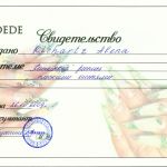 Mittlerweile besitze ich 10 Zertifikate für das Nageldesign (man lernt ja nie aus!) und möchte mich noch weiterhin in der Nailart fortbilden. In 2003 habe ich erfolgreich die Prüfung zur staatlich-geprüften Nageldesignerin in Minsk (Weißrussland) abgelegt und würde mich freuen, Sie demnächst in meinem kleinen Nagelstudio ELENA begrüßen zu dürfen.